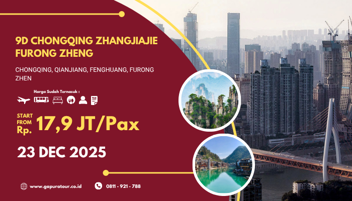 Tertarik untuk liburan ke Chongqing? Anda bisa mengikuti Paket Tour 9D Chongqing Zhangjiajie Furong Zheng dari Gapura Tour & Travel. Anda bisa langsung menghubungi tim Marketing kami DI SINI, melalui nomor kontak WhatsApp untuk langsung berkonsultasi mengenai ketersediaan Paket Tour ini.