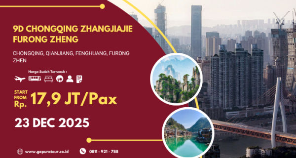 Berkumpul di Bandara Soekarno-Hatta untuk memulai perjalanan menuju Chongqing, salah satu kota metropolitan terbesar di China. Setibanya di Chongqing, Anda akan dijemput dan langsung diantar menuju hotel untuk beristirahat.